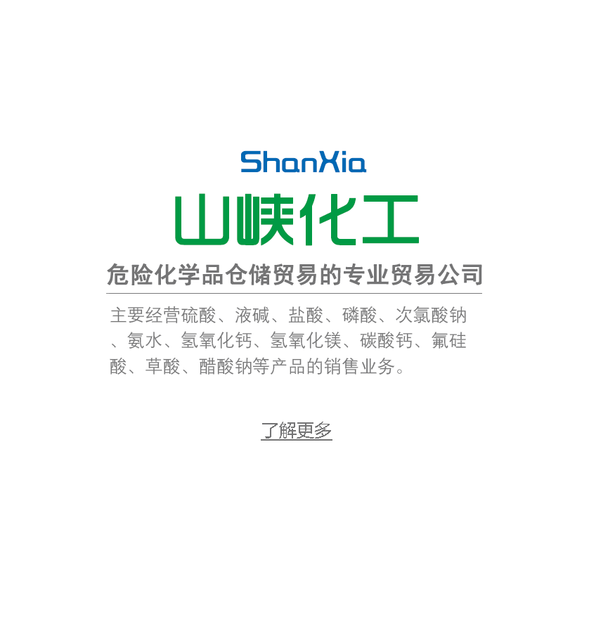 安庆市山峡化工有限公司成立于2013年1月,主营化工产品98%浓硫酸、精制酸(蓄电池酸)、稀硫酸定制、32%液碱、片碱、纯碱、氢氧化钾、氢氟酸、氢氧化钠、盐酸、磷酸、次氯酸钠、氯化钙、氨水、氢氧化钙、氢氧化镁、碳酸钙、氟硅酸、草酸、醋酸钠等化工产品。